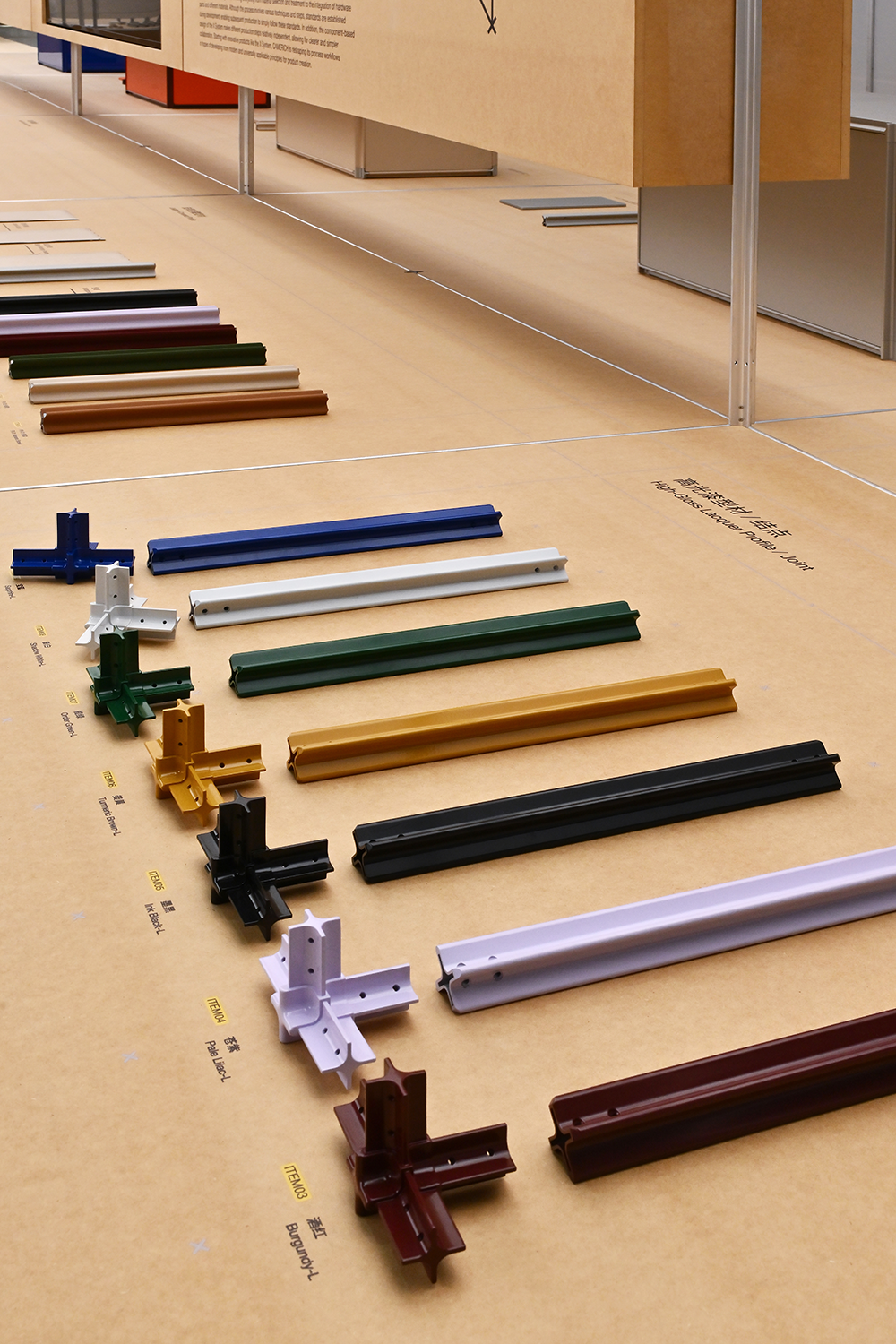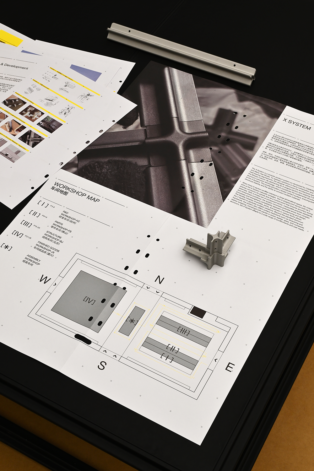 「折叠车间 X System Workshop」展览以“车间”为概念,直观地呈现X System的研发制造过程。展览现场整理了上百件实物,包括设计阶段的概念图、手稿、3D打印模型,打样测试阶段的原材料、模具,工艺开发阶段的零配件、不同表面处理的型材和结点,以及最终的部分成品等物件。